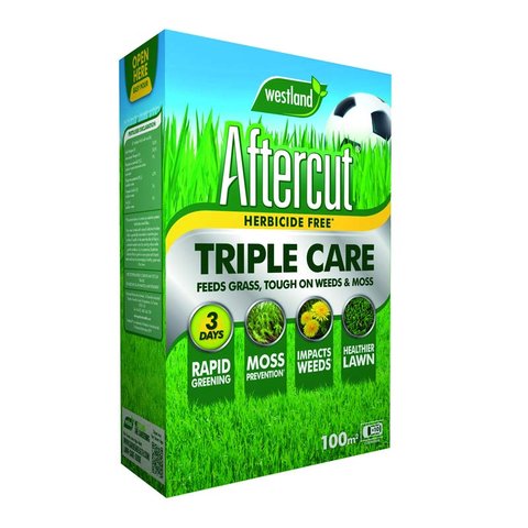 Aftercut Triple Care is a lawn treatment formulated to tackle weeds without herbicides. The added iron creates challenging conditions for moss to thrive. The balanced nutrient level creates a healthier lawn that will look greener in just 3 days.