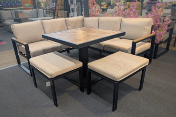 Crafted with a robust powder-coated aluminium frame and finished with plush, all-season cushions, this set combines comfort and durability. The central dining table features a wood-effect tabletop for a warm, natural touch that pairs beautifully with the sleek monochrome base.