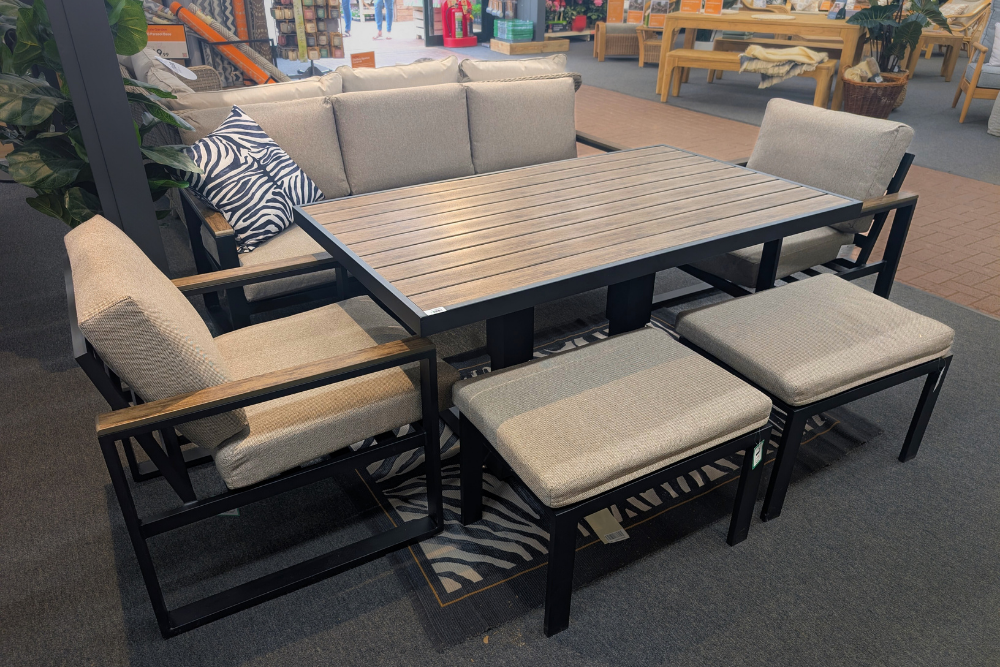 Crafted with a sleek matte black aluminium frame and wood-effect armrests, this set brings a touch of industrial sophistication to outdoor relaxation. The generously sized slatted dining table and versatile seating options—including armchairs, stools, and a central sofa—make it ideal for both dining and unwinding.