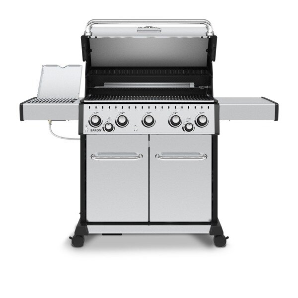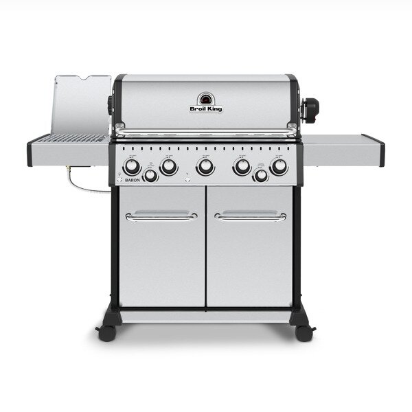 The Baron™ S 590 Series features 3,677 sq. cm primary cooking surface and includes 5 stainless steel Dual-Tube™ burners, cast aluminium cookbox, reversible heavy-duty cast iron cooking grids, illuminated control knobs, stainless steel Flav-R-Wave™ cooking system, and electronic ignition. The 500 series features stainless steel drop-down side shelves and enclosed cabinet base. The 590 IR series features a powerful infrared side burner.