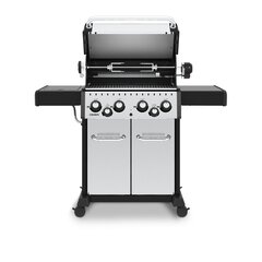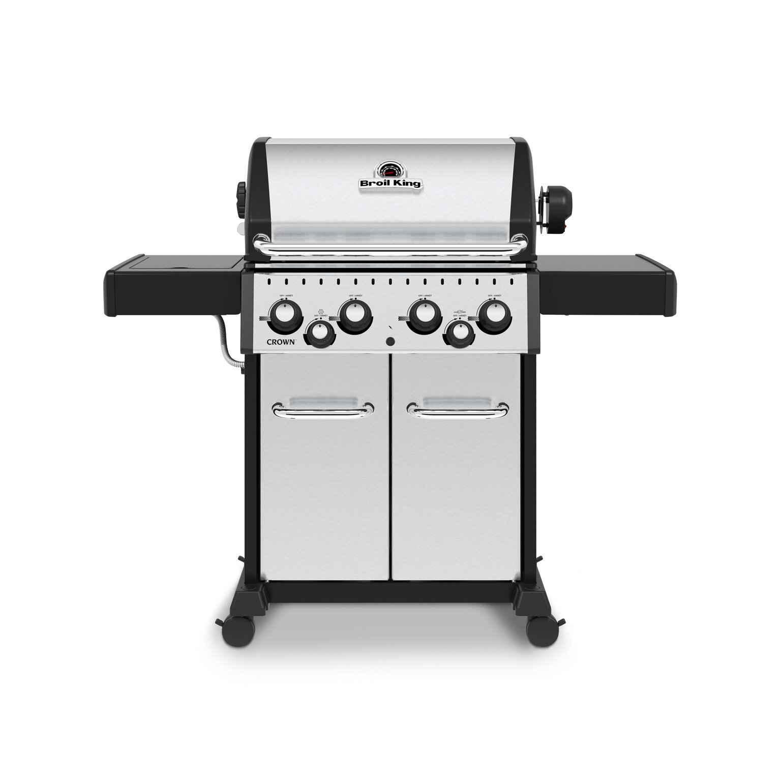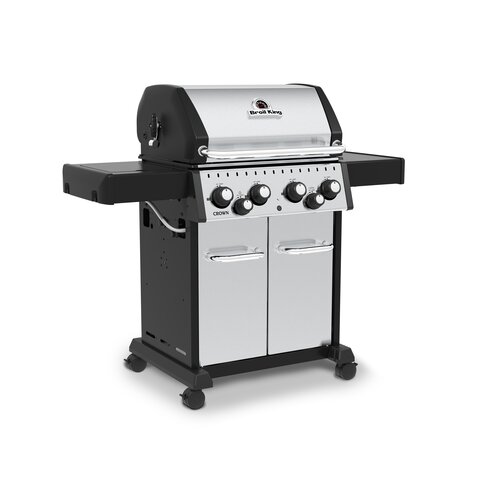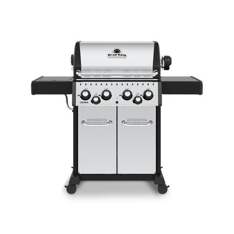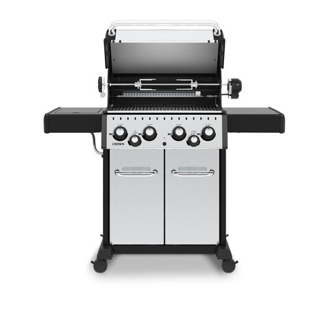 The Broil King Crown™ S 400 cabinet series features features 2,968 sq. cm primary cooking surface and includes 4 stainless steel Dual-Tube™ burners, cast aluminium cook box, reversible heavy-duty cast iron cooking grids, stainless steel Flav-R-Wave™ cooking system, and electronic ignition. The 400 cabinet series features stainless steel lid and doors and black powder coat drop down side shelves, and an enclosed cabinet base. Rotisserie Kit included.