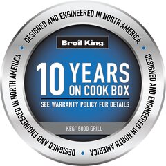 The Broil King® Keg™ 5000 - Features a 3,097 sq. cm total cooking surface, including a 1,807 sq. cm cast iron cooking grate, 1,290 sq. cm chrome secondary cooking surface, 2 removable side shelves and wheeled base that is trailer hitch adaptable. Includes Roto-Draft™ damper system with pull-out ash tray. Colour – Metallic Charcoal Grey. Multi-tool included.