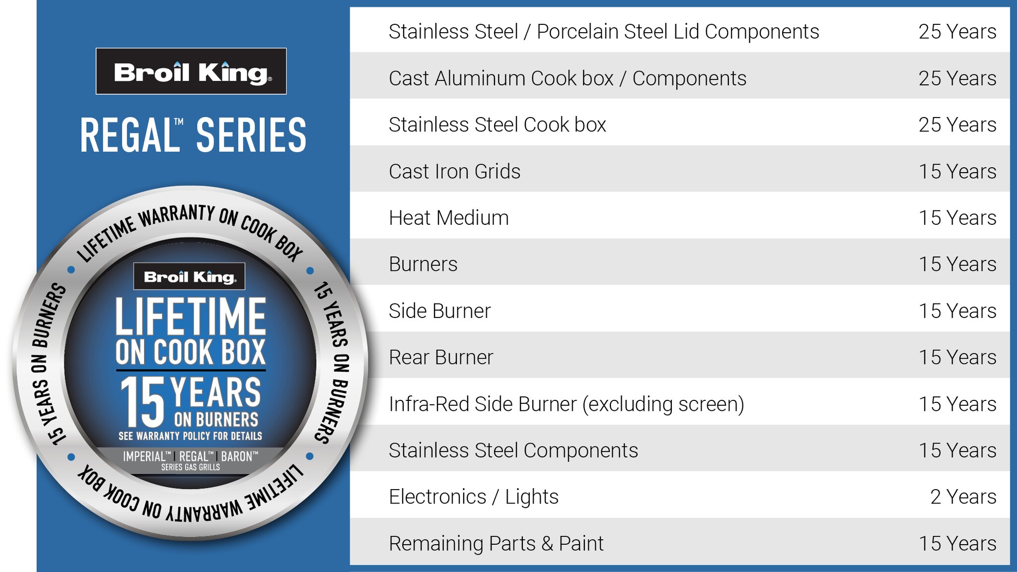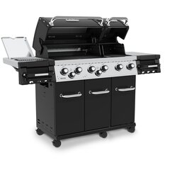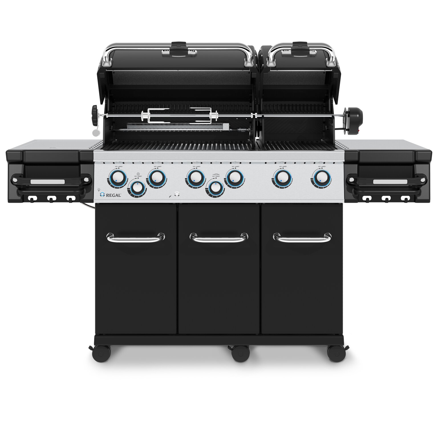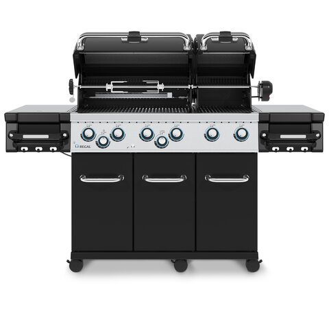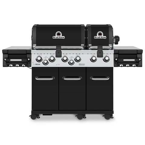 The Broil King® Regal™ 690 IR features two totally independent ovens with a total of 4,838 sq. cm of primary cooking surface and includes 6 stainless steel Dual-Tube™ burners, illuminated control knobs, 6 reversible heavy-duty cast iron cooking grids, stainless steel Flav-R-Wave™ cooking system, and electronic ignition. The S 690 IR features 9mm stainless steel rod cooking grids and a powerful infrared side burner.