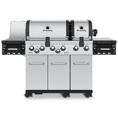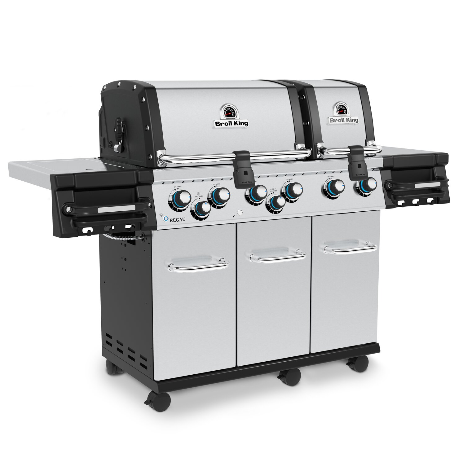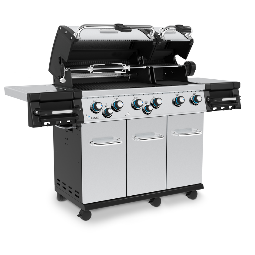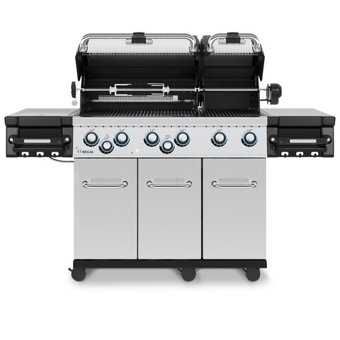 The Broil King® Regal™ S 690 IR features two totally independent ovens with a total of 4,838 sq. cm of primary cooking surface and includes 6 stainless steel Dual-Tube™ burners, illuminated control knobs, 6 reversible heavy-duty cast iron cooking grids, stainless steel Flav-R-Wave™ cooking system, and electronic ignition. The S 690 IR features 9mm stainless steel rod cooking grids and a powerful infrared side burner.