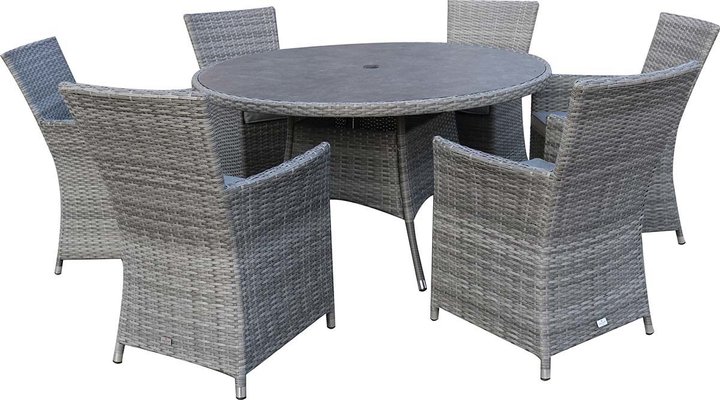 The timeless features included with the Cayman 6 Seat Round Dining Set are set in a tonal mix of grey shades. With its sleek, padded cushions and ergonomic curves, you can maximise your entertaining space. Equally modern and classic, the Cayman range in its gorgeous grey hues adds a fresh twist to the traditional weave. In addition, the innovative toughened, imitated ceramic tabletops boast an exclusive look.