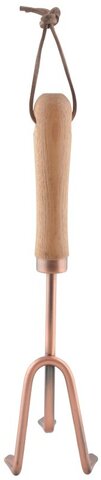 This traditional carbon steel garden tool has been finished with a decorative copper plate. This sturdy and durable rake fork is ideal dibbing root balls and completely removing weeds with long taproots. This shovel also comes with a depth measure both in cm and Inches. Leather hanging loop.