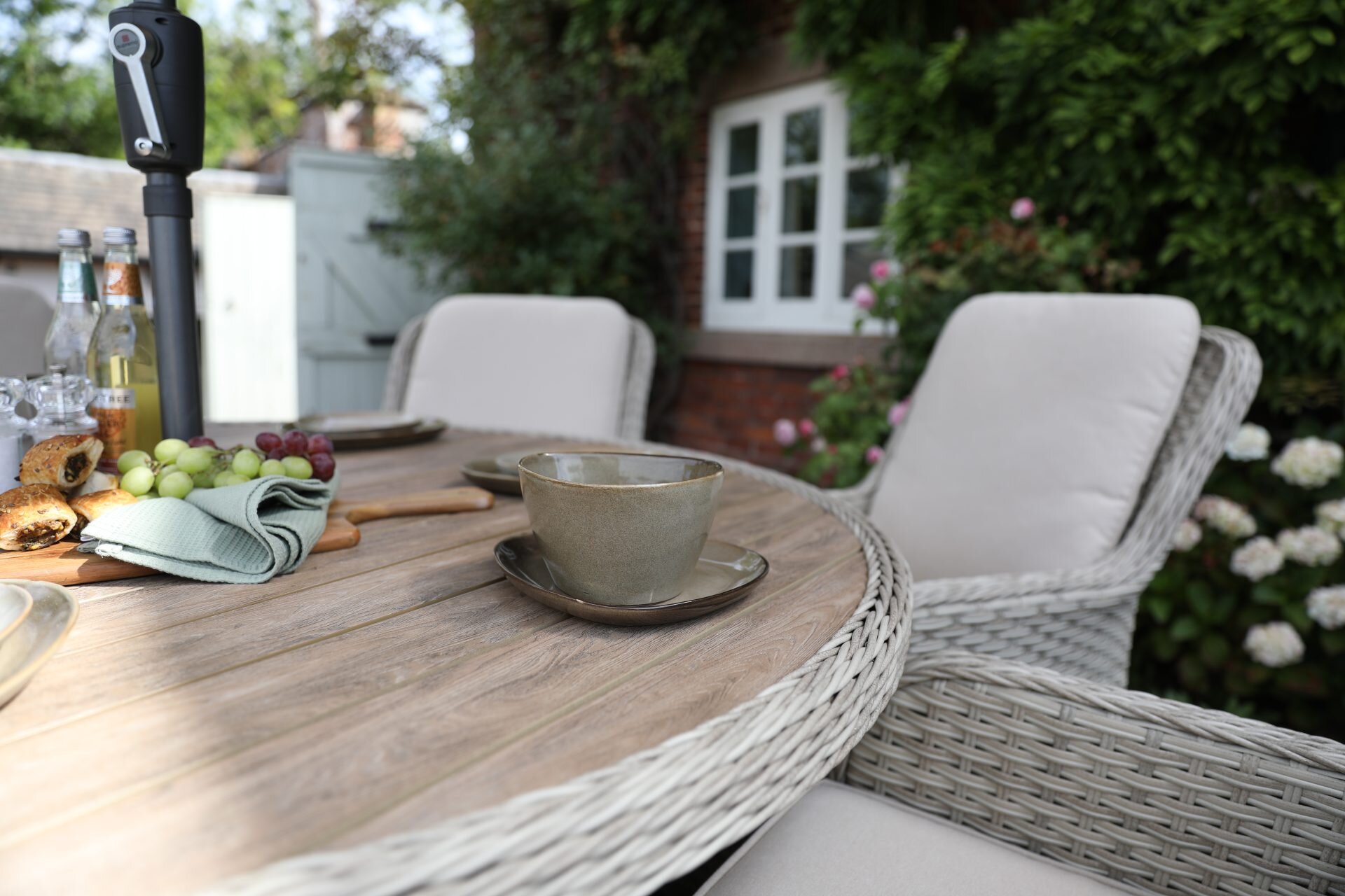 Enjoy a quiet moment outdoors with the Hemsby 6 Seat Round Set. Generous highback chairs and masterful polywood tabletops are combined with charm and gentle tones to make this picture-perfect Hemsby set. With detailed weave edging, subtle natural tones and beautiful soft cushions, this set will look the part in any garden setting. Delicate curves are accompanied by a twin 5mm weave lushly wrapped around solid aluminium frames.