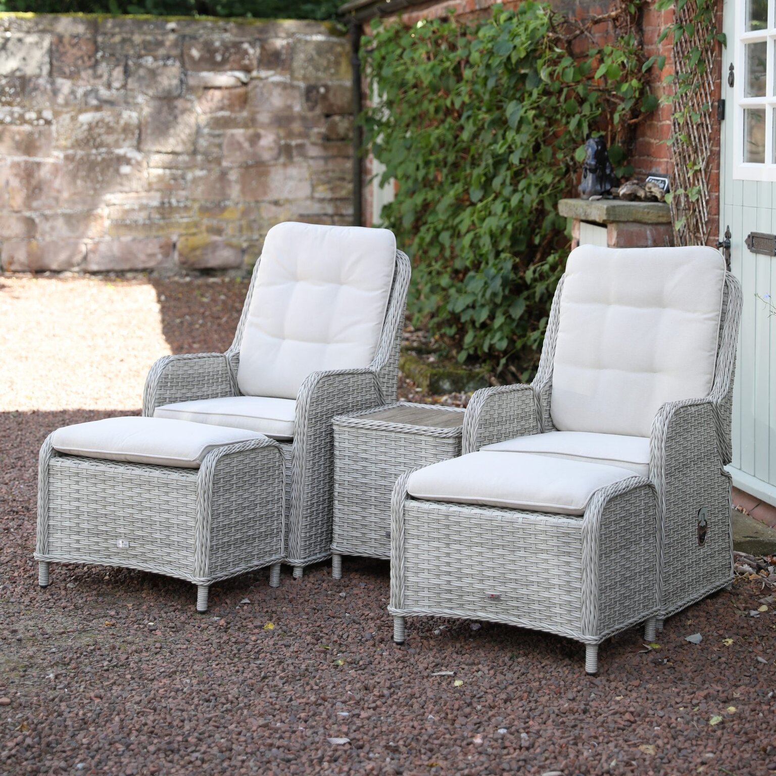 The Hemsby Dual Recliner Set with Footrests includes two recliner chairs, equipped with a reclining function that allows you to adjust the seating position to your preferred level of comfort. Generous highback chairs and masterful polywood tabletops are combined with charm and gentle tones to make this picture-perfect Hemsby set. With detailed weave edging, subtle natural tones and beautiful soft cushions, this set will look the part in any garden setting. Delicate curves are accompanied by a twin 5mm weave lushly wrapped around solid aluminium frames.