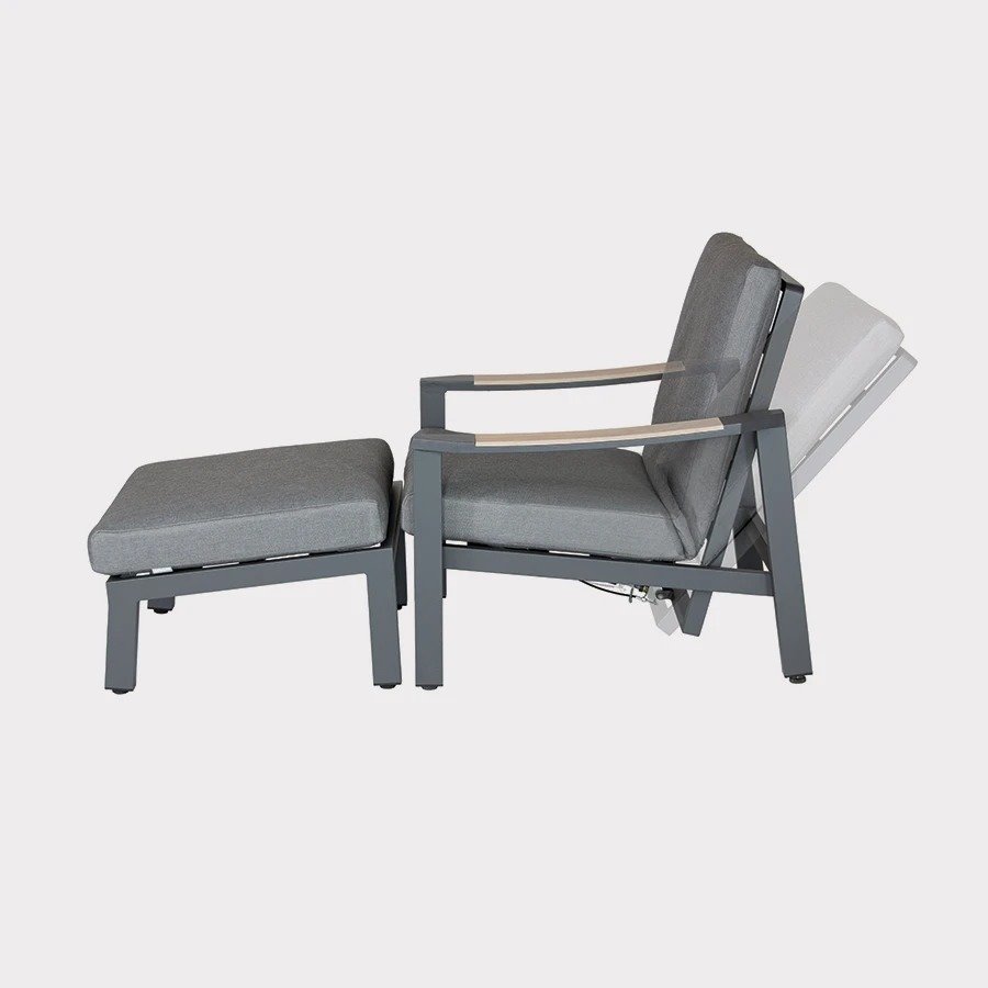 The versatile Elba Relaxer comes with unlimited reclining positions so you can find the perfect position to relax. The footstool can be put away and the chair can be used for upright seating or you can recline the chair fully back to turn it into a sun lounger. The quality is in the detail with FSC® certified Teak wood slats on the armchairs, adding style to your outdoor living space.