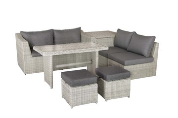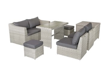 £ 1,799.00Made for smaller spaces, the Palma Compact set has a very versatile modular design so you can use it as a corner style set or more or a traditional sofa set layout. The cushions conveniently fit into the storage box. The table is a casual dining type table which means you can use for both dining and lounging. One of the best design features about this set is how the chairs slide into the back of the sofa when not in use. Made using an aluminium frame with hand-woven 5mm half-round weatherproof synthetic weave.