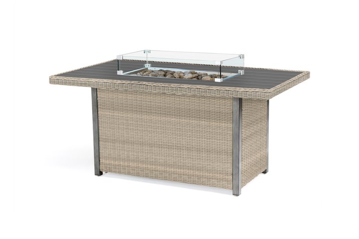 The Palma Fire Pit table is a unique member of the Casual Dining range, perfect for both formal and informal outdoor dining. The weatherproof aluminium slat top table includes a weathered wood look. The fire pit at the centre of the table comes with a lid to keep the fire covered when not in use. The glass surround prevents ash from escaping the fire pit and is detachable.