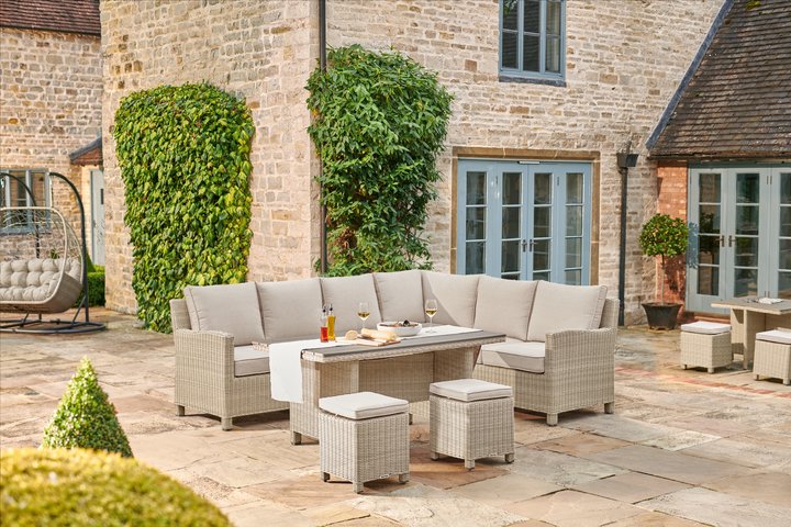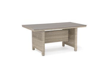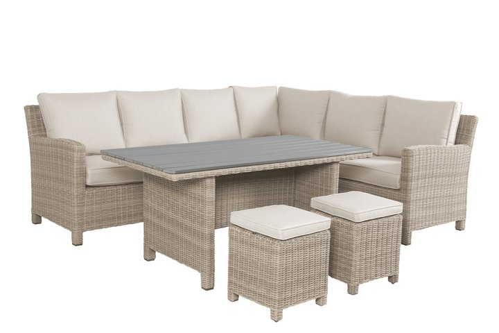 Weatherproof wicker wraps around a strong aluminium frame. Our synthetic wicker is handwoven and comes in a choice of two colours: white wash with grey taupe cushions and oyster with stone cushions. With the option of a left-handed or a right-handed corner set, you can fit your garden furniture set into any spot. The sofa includes comfortable, taupe cushions with a foam core. Our Casual Dining concept is for both luxury meals outdoors and lounging in the sun.