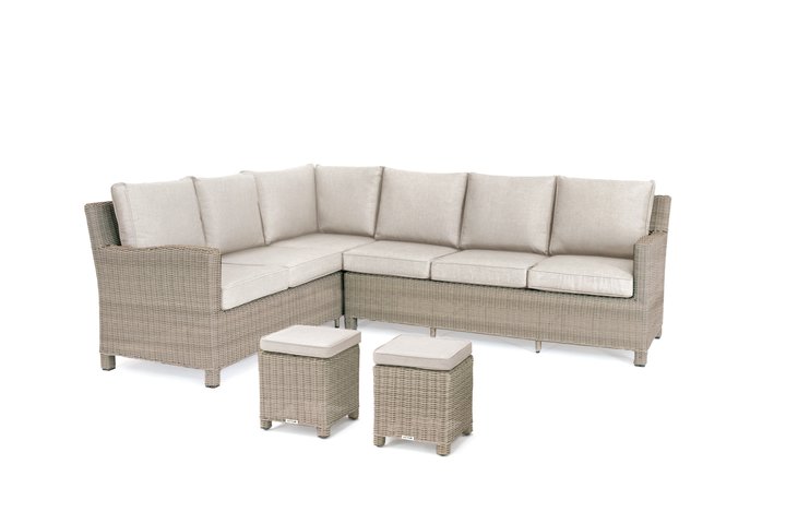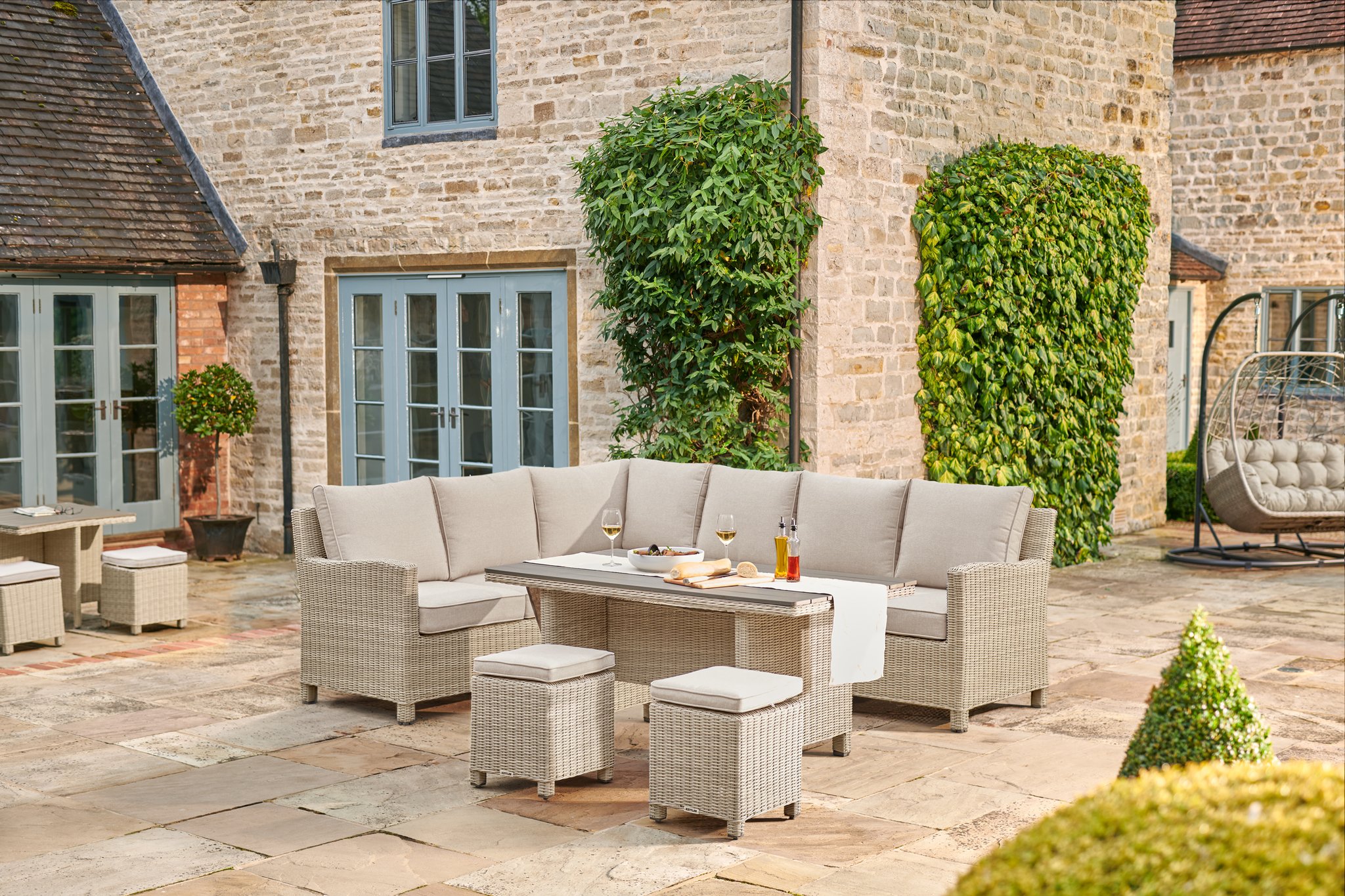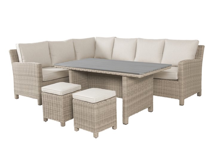Weatherproof wicker wraps around a strong aluminium frame. Our synthetic wicker is handwoven and comes in a choice of two colours: white wash with grey taupe cushions and oyster with stone cushions. With the option of a left-handed or a right-handed corner set, you can fit your garden furniture set into any spot. The sofa includes comfortable, taupe cushions with a foam core. Our Casual Dining concept is for both luxury meals outdoors and lounging in the sun.