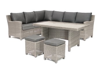Weatherproof wicker wraps around a strong aluminium frame. Our synthetic wicker is handwoven and comes in a choice of two colours: white wash with grey taupe cushions and oyster with stone cushions. With the option of a left-handed or a right-handed corner set, you can fit your garden furniture set into any spot. The sofa includes comfortable, taupe cushions with a foam core. Our Casual Dining concept is for both luxury meals outdoors and lounging in the sun.