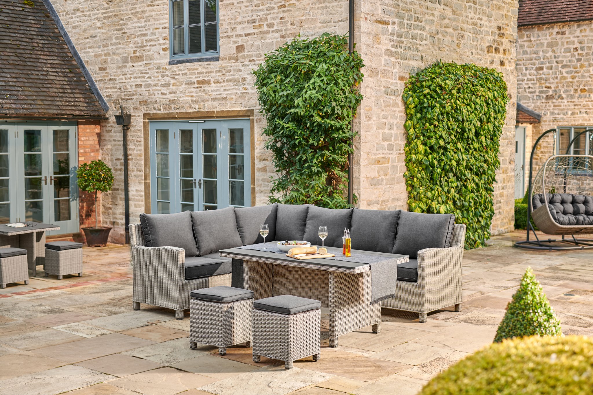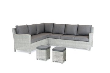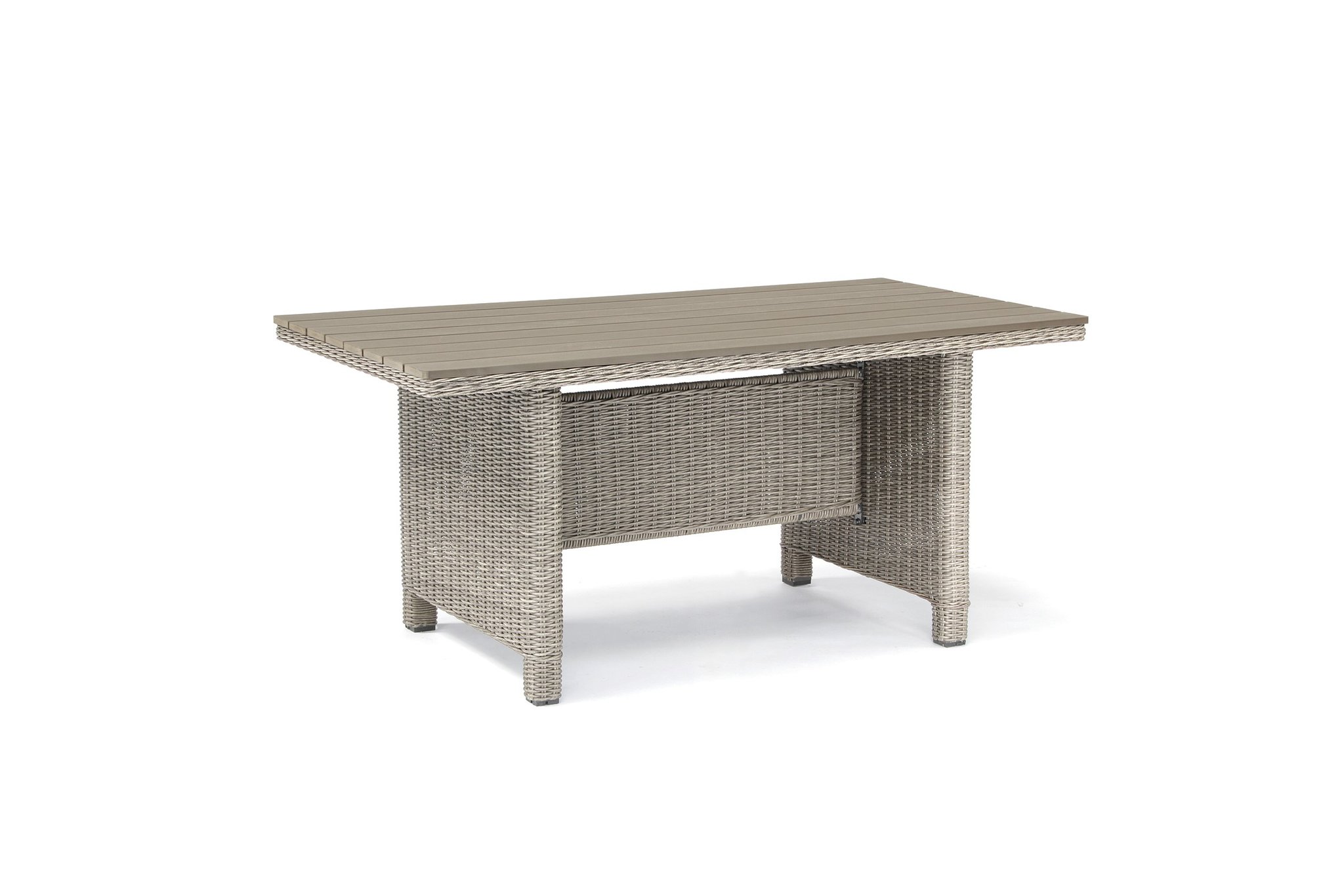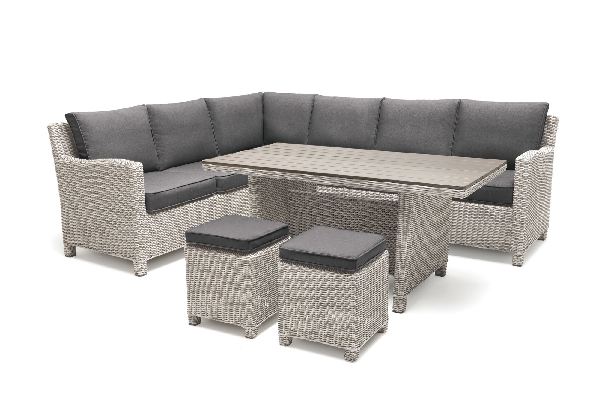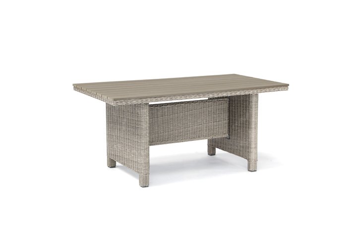 Weatherproof wicker wraps around a strong aluminium frame. Our synthetic wicker is handwoven and comes in a choice of two colours: white wash with grey taupe cushions and oyster with stone cushions. With the option of a left-handed or a right-handed corner set, you can fit your garden furniture set into any spot. The sofa includes comfortable, taupe cushions with a foam core. Our Casual Dining concept is for both luxury meals outdoors and lounging in the sun.