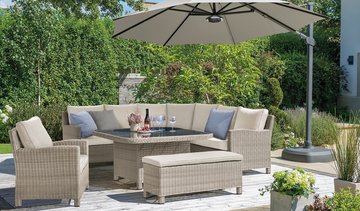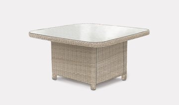 Dine in style around the Palma Grande table with a glass top, suitable for indoor and outdoor use. Made to the highest standards with a robust aluminium frame and weatherproof synthetic wicker. The weather-resistant table can be left outdoors all year round without it deteriorating or fading. The tempered glass table top provides a smooth finish and is easy to clean.