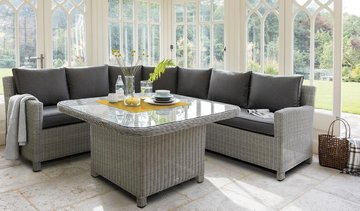 Dine in style around the Palma Grande table with a glass top, suitable for indoor and outdoor use. Made to the highest standards with a robust aluminium frame and weatherproof synthetic wicker. The weather-resistant table can be left outdoors all year round without it deteriorating or fading. The tempered glass table top provides a smooth finish and is easy to clean.