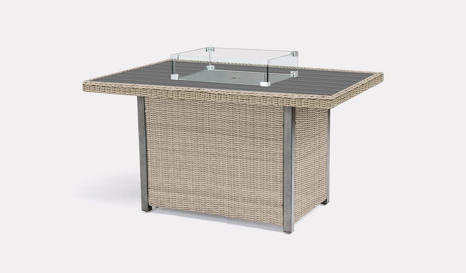 Part of the popular Palma Casual Dining Collection, the Mini Fire Pit Table is ideal for outdoor entertaining. It is made from hard-wearing aluminium frame, which is beautifully plaited with synthetic wicker. The tabletop is made from aluminium slats and have been hand painted, giving it a weathered wood look. The weather-resistant table can be kept outdoors all year round without it fading or cracking.