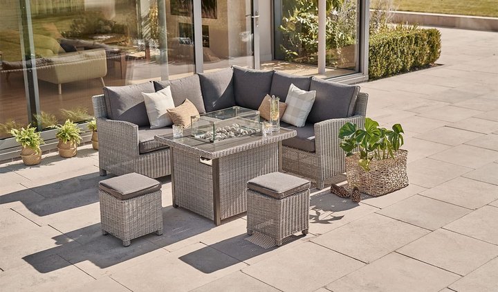 Part of the popular Palma Casual Dining Collection, the Mini Fire Pit Table is ideal for outdoor entertaining. It is made from hard-wearing aluminium frame, which is beautifully plaited with synthetic wicker. The tabletop is made from aluminium slats and have been hand painted, giving it a weathered wood look. The weather-resistant table can be kept outdoors all year round without it fading or cracking.