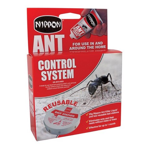 The Nippon Ant Control System will come to your rescue with a quick and convenient way to eliminate ants and their nests without trace. This very useful Nippon product has two refillable plastic disc shaped traps with tiny holes which can be punched in the sides for the ants to enter. Simply put a few drops of Nippon Ant Killer Liquid (included in the box) inside the traps and the ants will soon find their way in. After feeding on this liquid they will carry it back to the colony where it is passed to the queen and all the other ants in the colony. Over a period of about 7 to 10 days a fatal dose of Nippon Ant Killer Liquid will build up in the queen herself, and eradicate the whole nest.