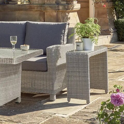 Place it at the end of a Palma Corner sofa or Palma Mini Corner sofa The garden table is lightweight and can go anywhere with ease. Glass sits onto top of the wicker frame and is securely held in place.