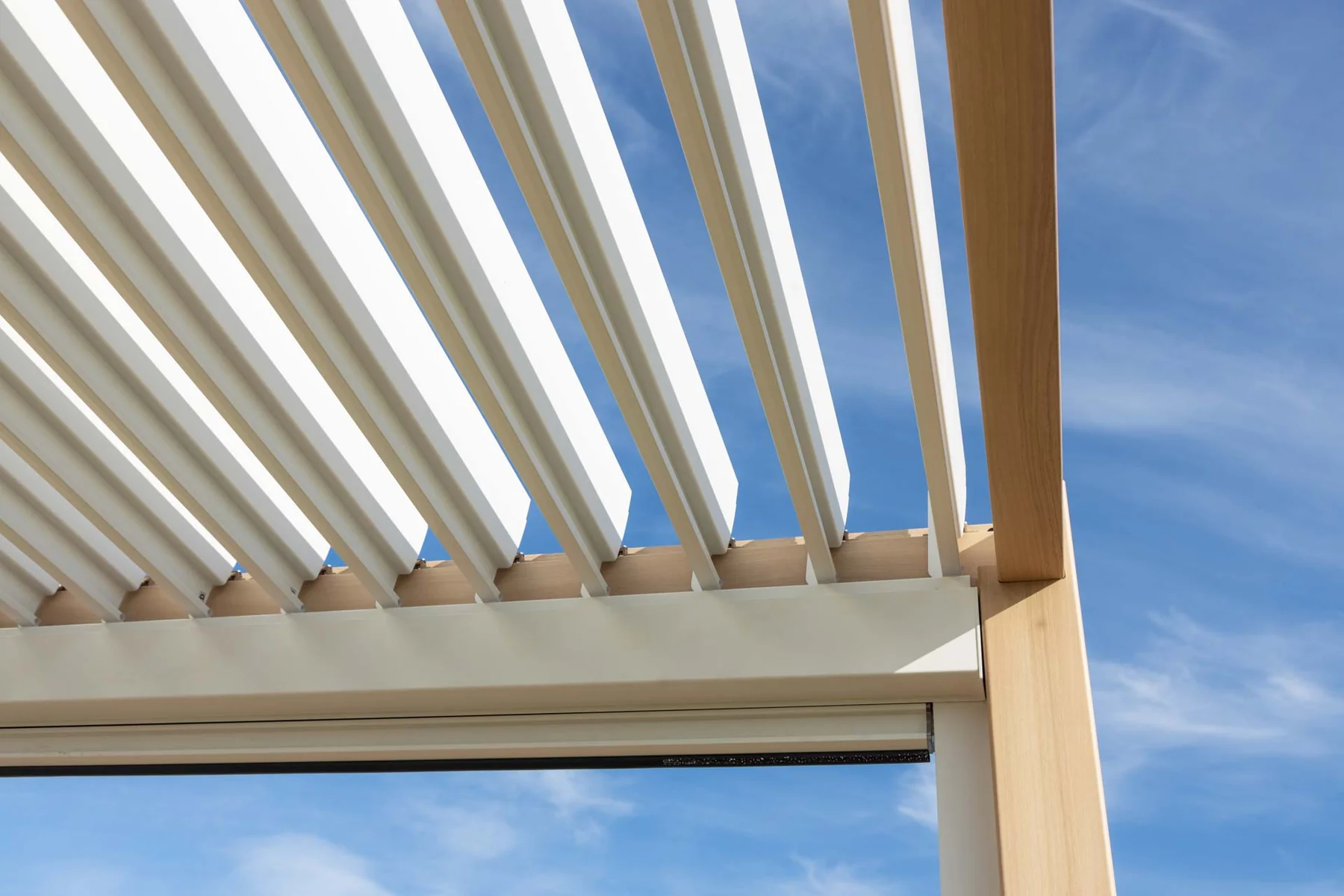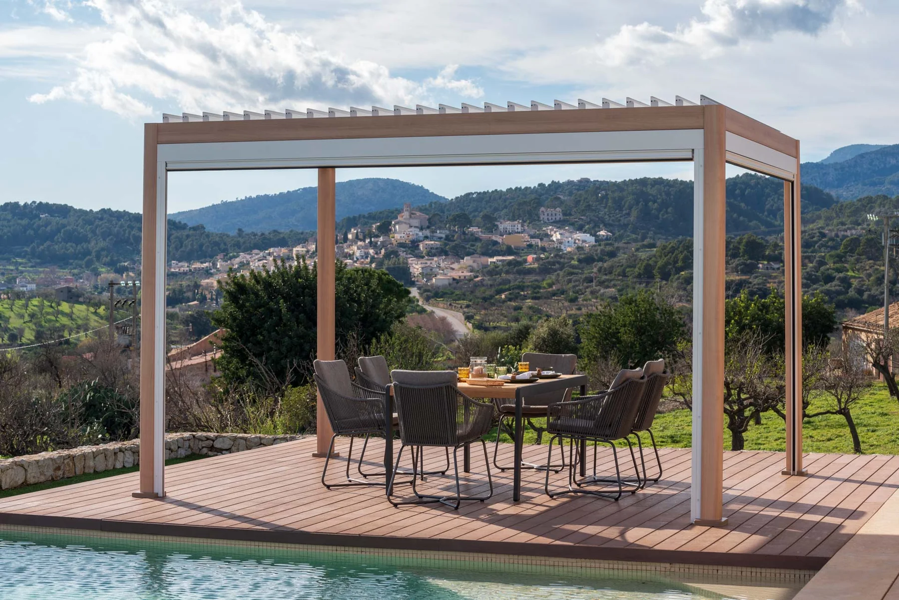 Relax in the shade under the Premium Pergola from Lifestyle Garden in a white & oak look aluminium frame and adjustable single layer louvred roof. This statement piece is great for covering your dining or lounge garden furniture set to enjoy the garden no matter how sunny it gets!