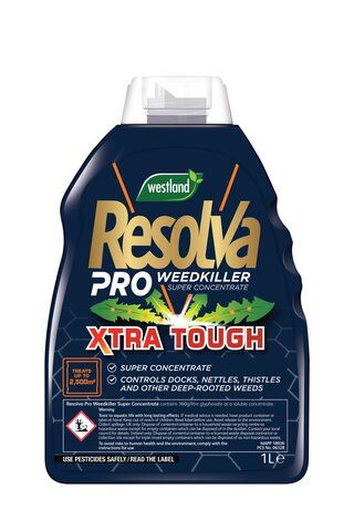 Resolva Pro Xtra Tough Super Concentrate is a super strength weedkiller concentrate. It is therefore ideal for clearing large areas of weeds. Resolva Pro Xtra Tough Super Concentrate kills weeds as well as roots and controls annual and deep-rooted perennial grass and broad-leaved weeds including bracken, broad-leaved dock, common couch, cleavers, colt’s foot, chickweed, common nettle, common thistle, creeping buttercup, curled dock, dandelion, ground elder, perennial sow thistle, plantains, red clover, scotch thistle, sheeps sorrel, spear thistle, speedwell, white clover, white dead nettle, willowherb, yarrow and many others.