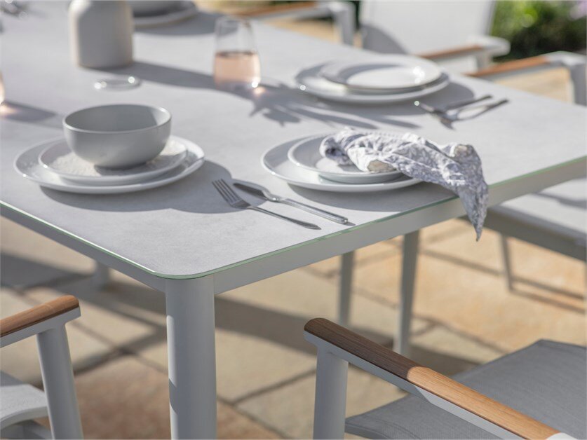 The Sofia 165 x 95cm Rectangle Dining Set with 6 Armchairs in Grey brings contemporary style and low-maintenance practicality to your outdoor space. The rectangular table pairs perfectly with six stackable Textilene chairs, designed for comfortable, breathable seating. A co-ordinating parasol and base provide shade when needed, making this set ideal for sunny mornings or relaxed evening meals. Durable aluminium frames and weather-resistant materials allow this set to remain outside season after season, while the soft Grey finish adds a fresh, modern touch.