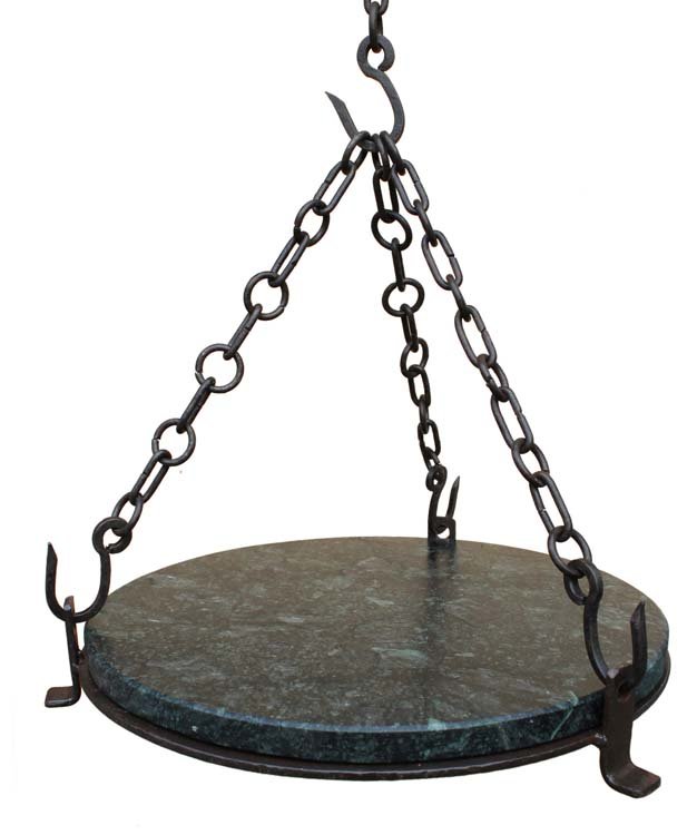 Includes natural soapstone plate, 3 chains and metal support ring.