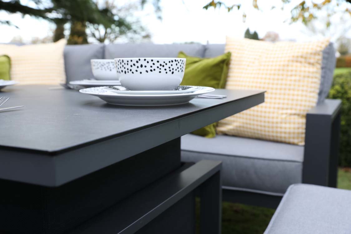 The supportive back bars will give the Melbury chair a powerful character and with the large plump back cushions, the comfort is unforgettable. The thick Polywood armrests fit in nicely with the powder-coated frames, creating an extra depth to the Melbury’s overall style. This luxury range consists of a compact corner sofa with two seats on either side of the corner unit, two additional footstools and an adjustable pump-action table. The summer-proof cushions in the Melbury range provide optimal comfort. All cushion covers are zipped for easy cleaning, and the fabric is designed to resist dampness and assist in drying.