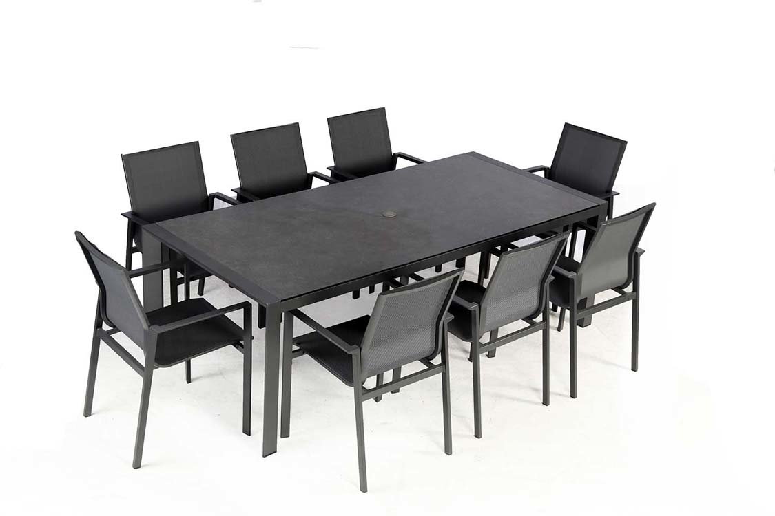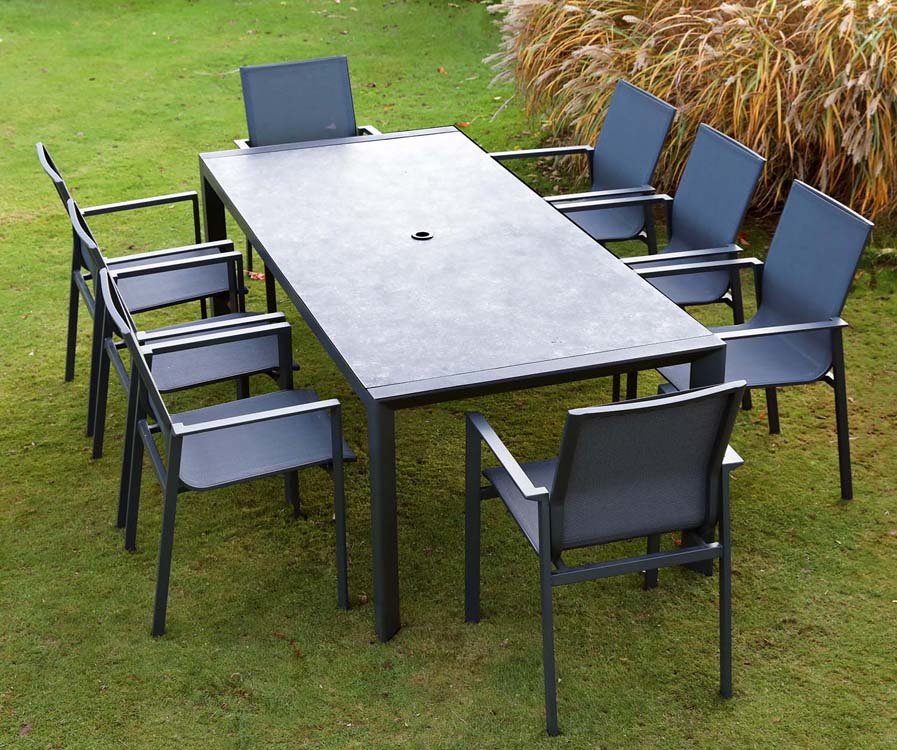 With its simple and elegant design, the Portobello set is a modern product that looks the part in town or the country. The practicality of stackable chairs while keeping their style is a benefit. Also, the matching chairs with textilene provide additional padding and comfort. This innovative range combines high-quality aluminium and soothing textilene, which will be a lasting investment. The charcoal or salted grey coloured aluminium chairs feature textilene slings which make them lightweight and easy to clean and beyond comfortable. Chairs are stackable for simple and straightforward storage.