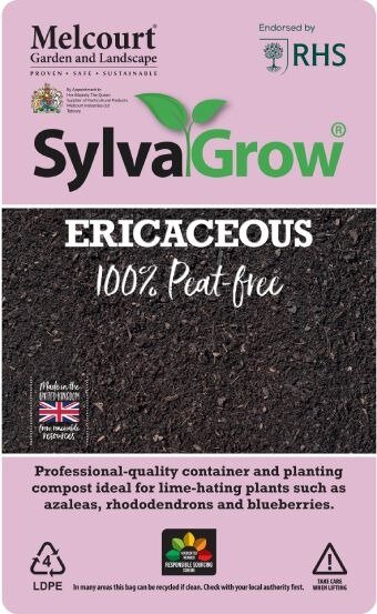 A unique blend of fine bark (a by-product of sustainably managed forests) and coir (from known, ethically-approved sources). SylvaGrow Ericaceous contains balanced nutrients sufficient for the first 4 - 6 weeks of growth. This professional-quality, 100% peat-free ericaceous compost is ideal for growing blueberries, rhododendrons, azaleas, heathers, camellias and other lime-hating plants in tubs and containers and for planting out.
