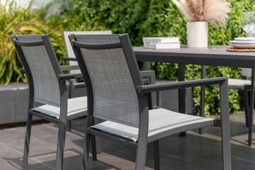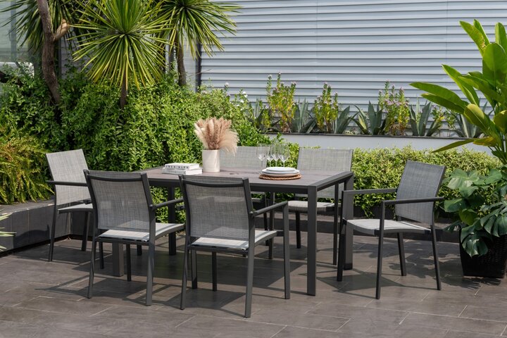 This Urbanite Deluxe 6-seater Garden Dining Set in Dark comes with six stackable chairs and one rectangular table, both made from high-quality aluminium, making it practical and stylish.