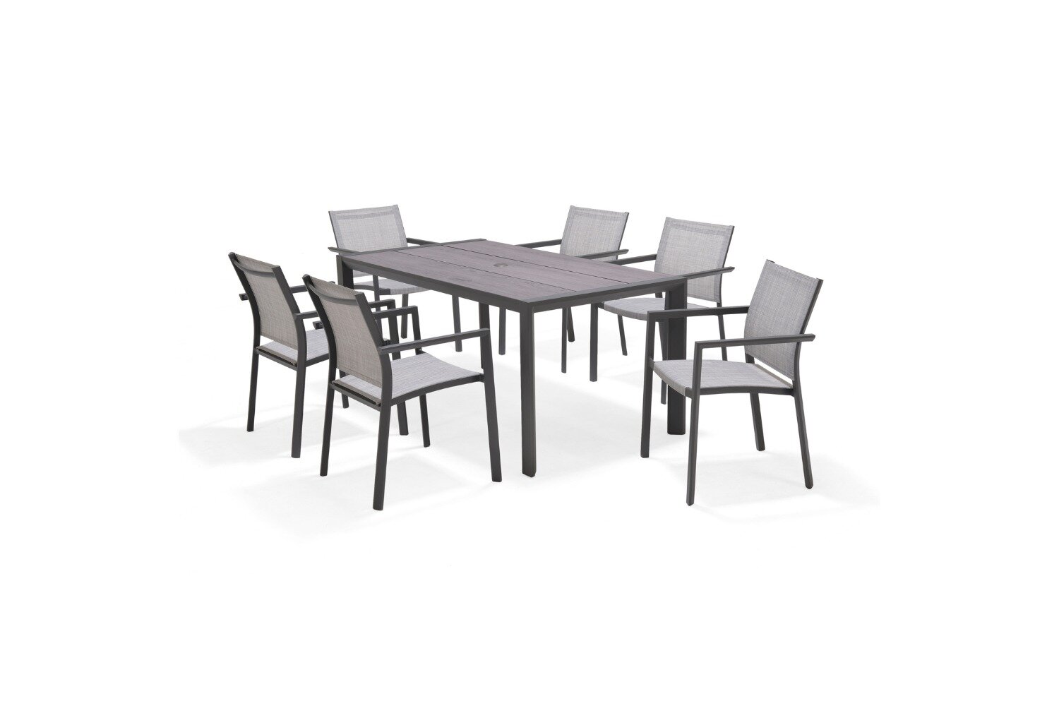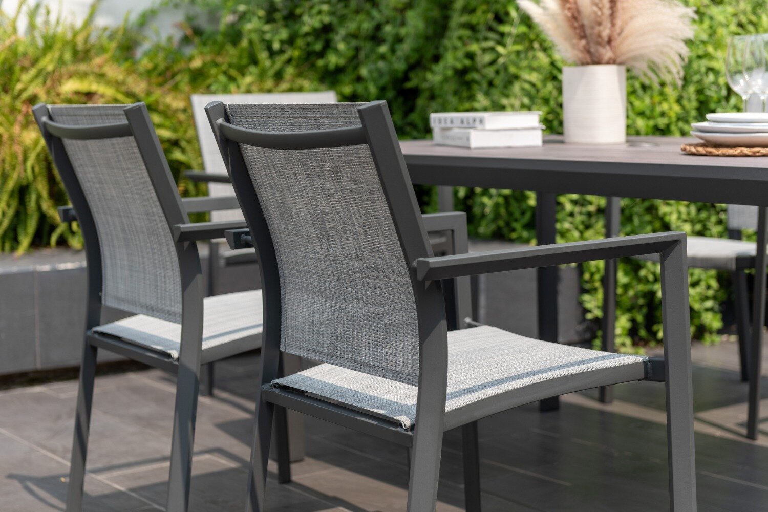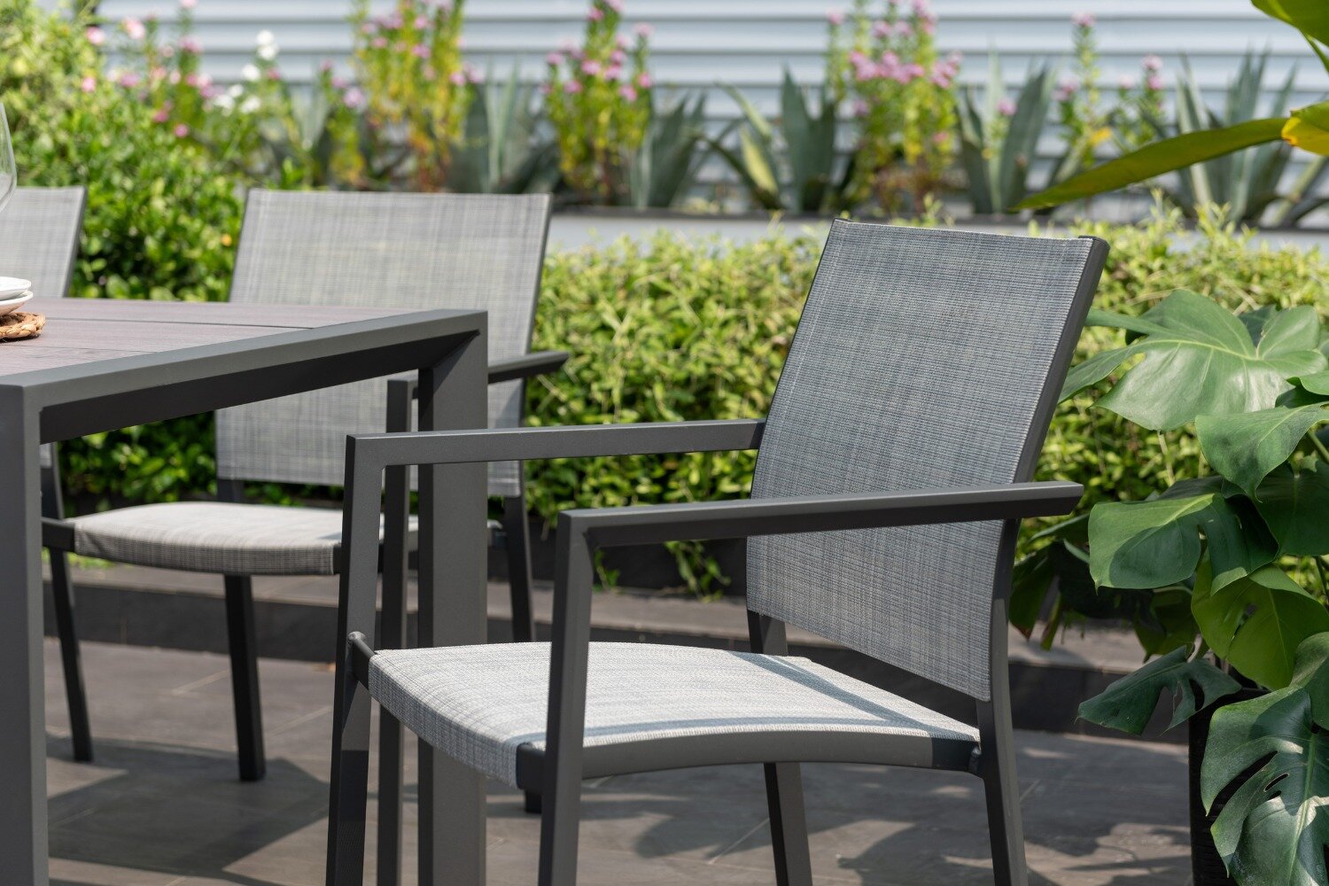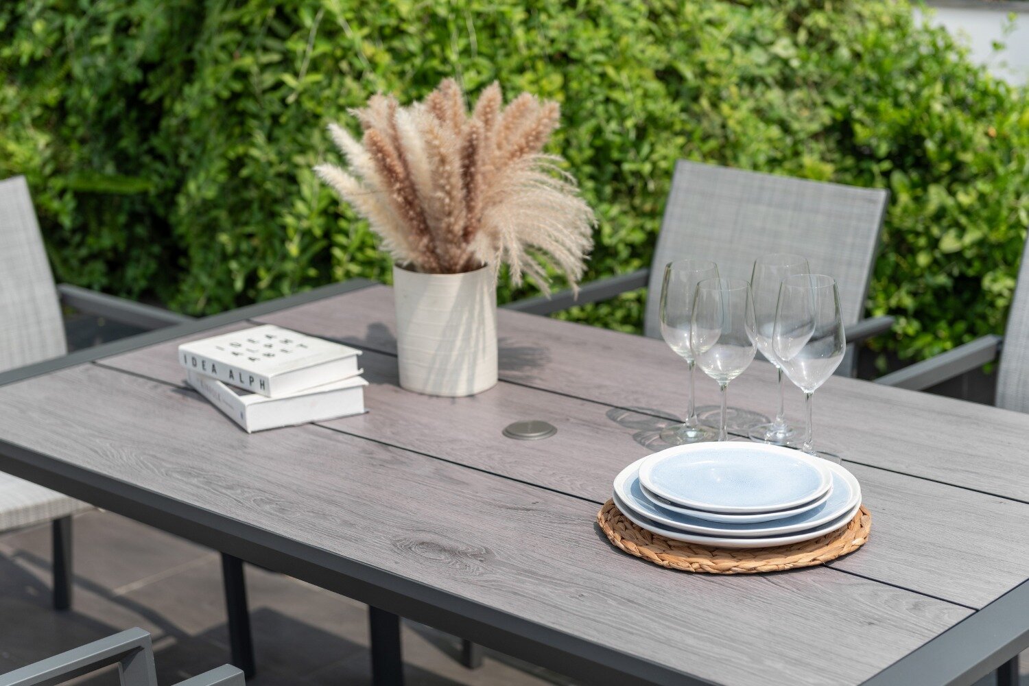 The chairs are manufactured from durable grey aluminium that is rust-free, and they have flexible Weather-net® seating, making them comfortable and long-lasting. The table’s top is made from DuraBoard®, a resilient mix of polyethylene resin and eucalyptus sawdust, and is complemented the look of real wood without the hassle of maintenance.