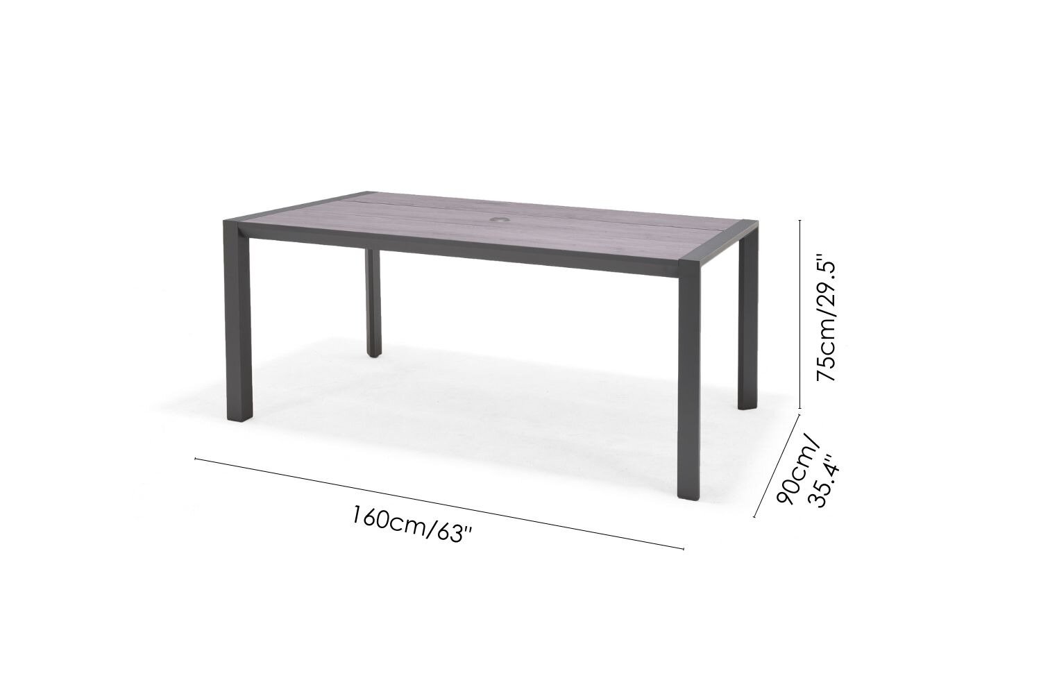 Rectangular table in rust-free grey-coloured aluminium frame with highly durable and maintenance-free Duraboard® tabletop.