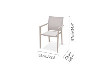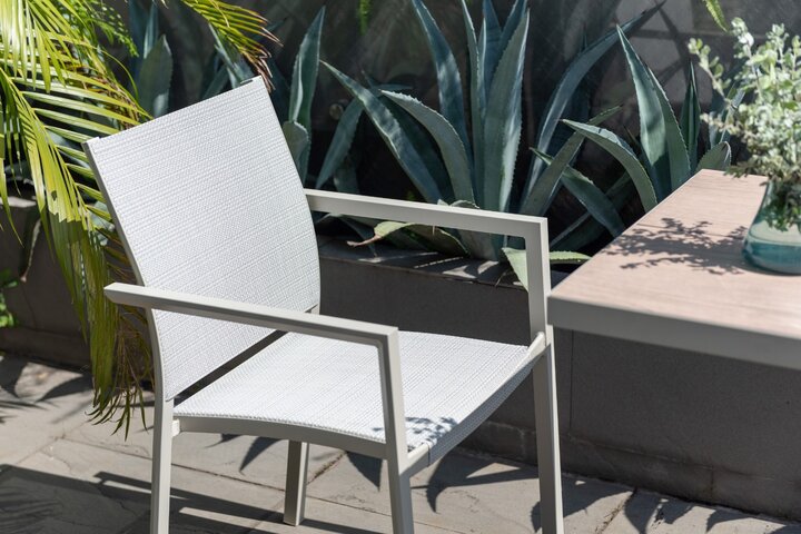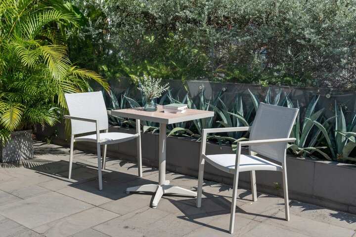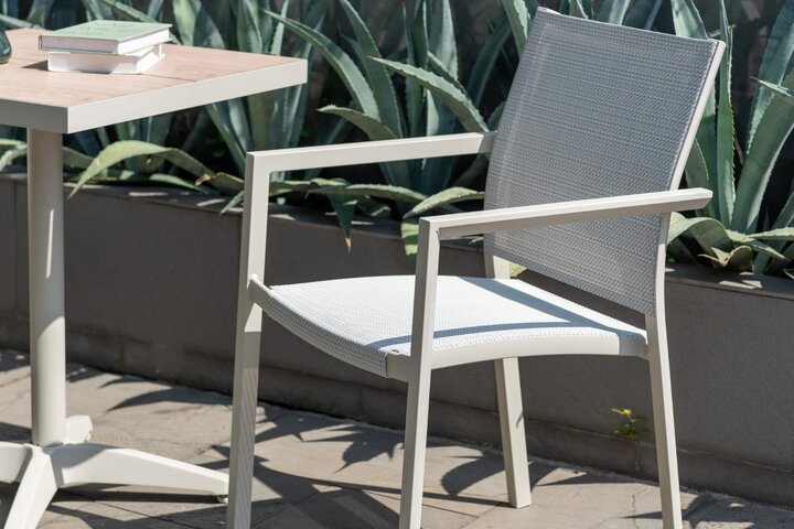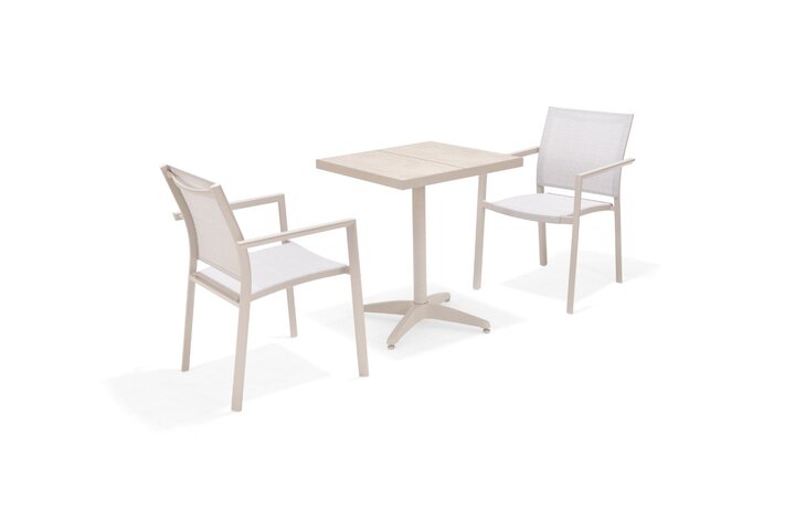 The Urbanite Bistro Set in Light includes two stacking chairs and one bistro table, making it ideal for morning coffee or casual seating for two people. The stacking chairs are made from rust-free and durable cream-coloured aluminium, ensuring they will stand the test of time. The chairs also feature flexible Weather-net® which provides a comfortable and supportive seat.