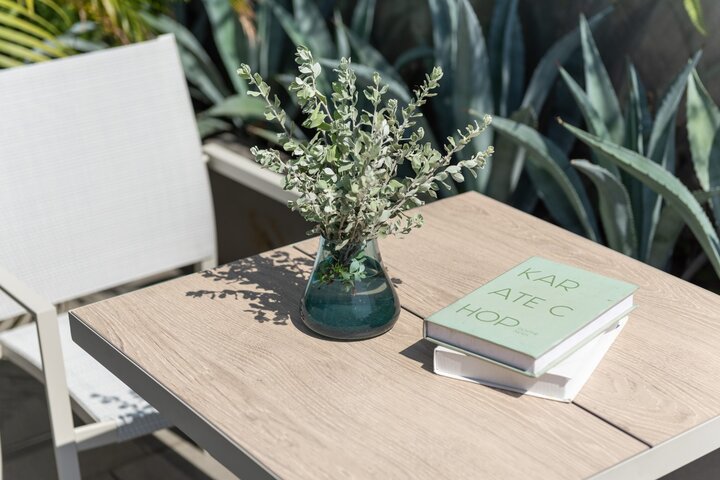The bistro table has a top made from DuraBoard®, a durable mix of polyethylene resin and eucalyptus sawdust. This material is complemented by the state-of-the-art printed wood effect, adding a touch of elegance to the set. The table is light-weight and maintenance-free which means it is easy to move and keep clean.